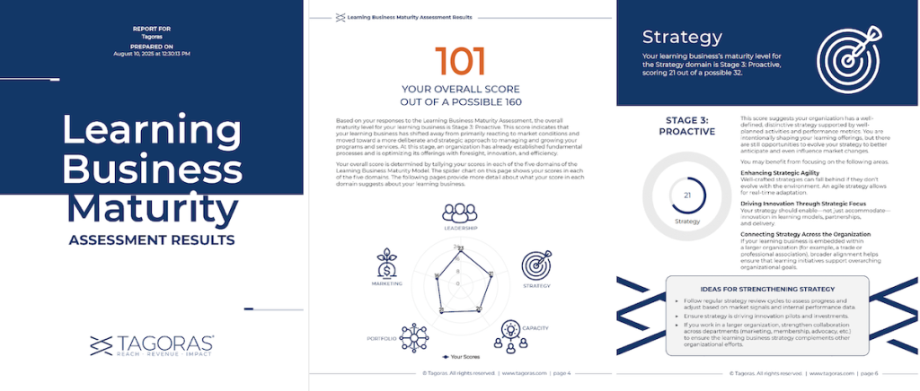 For nearly a decade, the Learning Business Maturity Model™ has been the go-to framework for market-facing learning businesses seeking to maximize reach, revenue, and impact. Now, you can measure your organization’s performance against this proven framework with the new Learning Business Maturity Assessment™—a powerful online tool that delivers instant, data-driven insight.